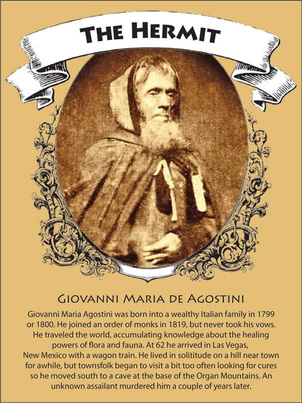 He found his way to Las Vegas, New Mexico accompanying a wagon train from Council Grove, Kansas along the Santa Fe Trail in 1863. When offered a ride on one of the wagons he said that he preferred to walk, and asked only for some cornmeal mush to nourish himself. By this time he went by the name Juan Maria d’Agostini. But to the religious settlers of early Las Vegas he was simply “the Hermit”. Due to his appearance and wise demeanor he was perceived of as a holy man, a healer and a miracle worker. He claimed to be none of these things. Nonetheless, throngs of locals collected wherever he resided, seeking counsel, healing and miracles.