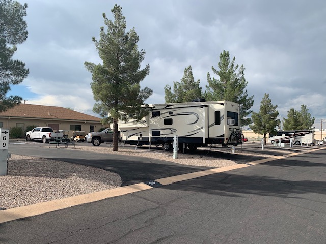 We are now at Butterfield Rv Resort here in Benson Arizona. We traveled 164 miles, from Deming New Mexico to here. Had a little rain when we left, but cleared up nice, for a good drive in. Benson is in the south eastern part of the state, we will be in this area at different parks, until the end of the year. Our spot is below.