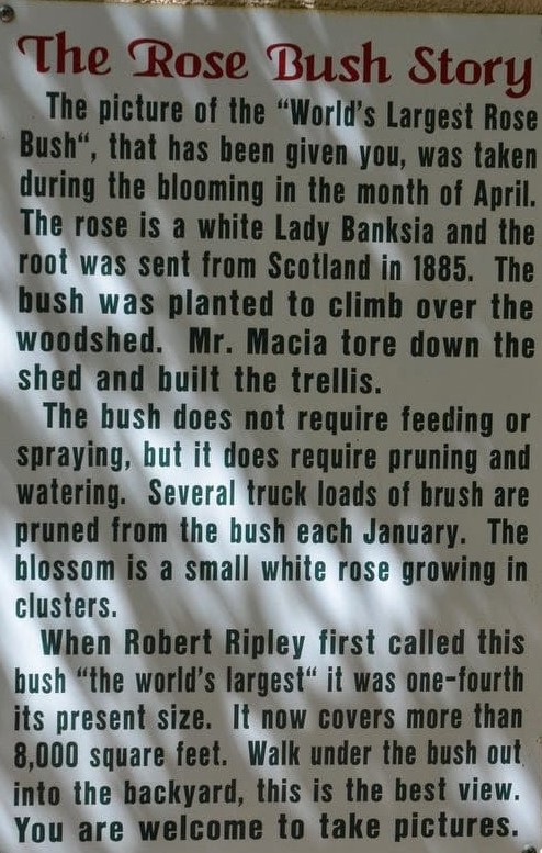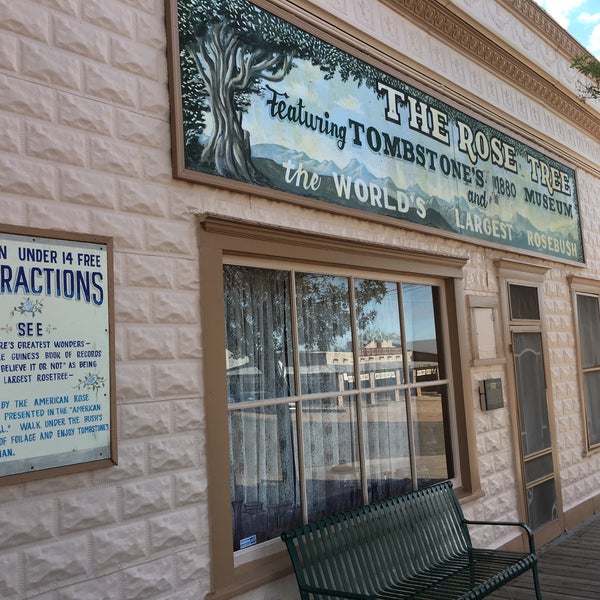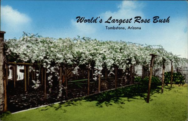 The World’s Largest Rose Bush is a white Lady Banksia that was planted in Tombstone in 1885 . The original root came from Scotland. From a single trunk, it spreads over an arbor that covers over 6,000 square feet. It was first declared the “world’s largest” in the late 1930’s and continues to grow.