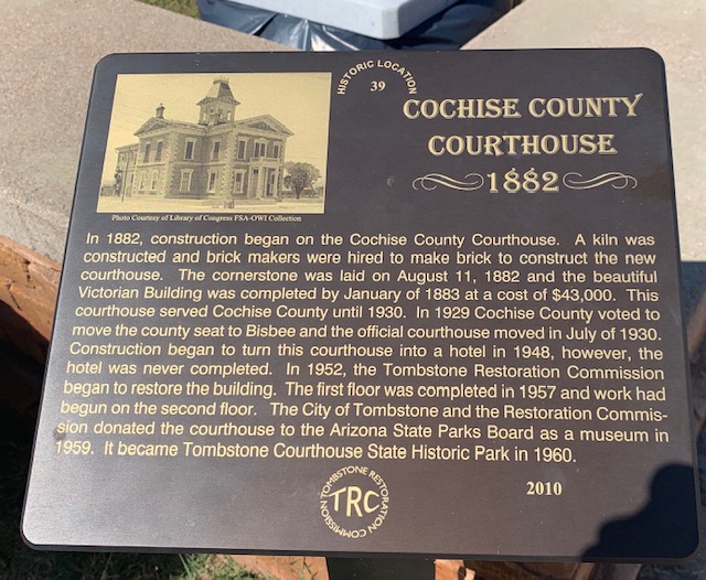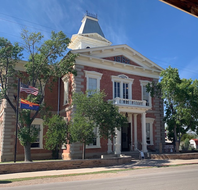 This is the original Cochise County/Tombstone Courthouse, which is now a state historic park. It was built in 1882 in the shape of a Greek cross. It is a two-story structure that once housed the offices of the Sheriff, Recorder, Treasurer, Board of Supervisors, Jail, and Courtrooms of Cochise County. Today this 12,000 sq.Ft. Courthouse is a museum that includes the following. . .