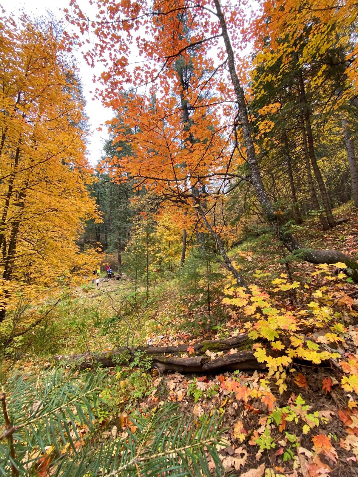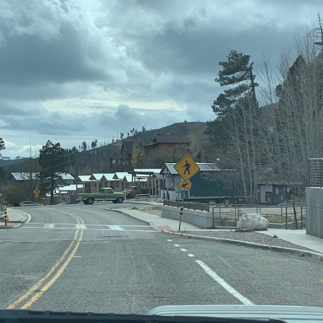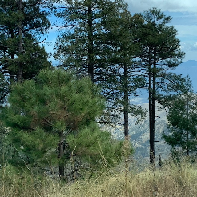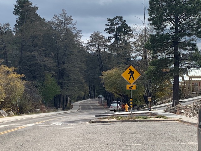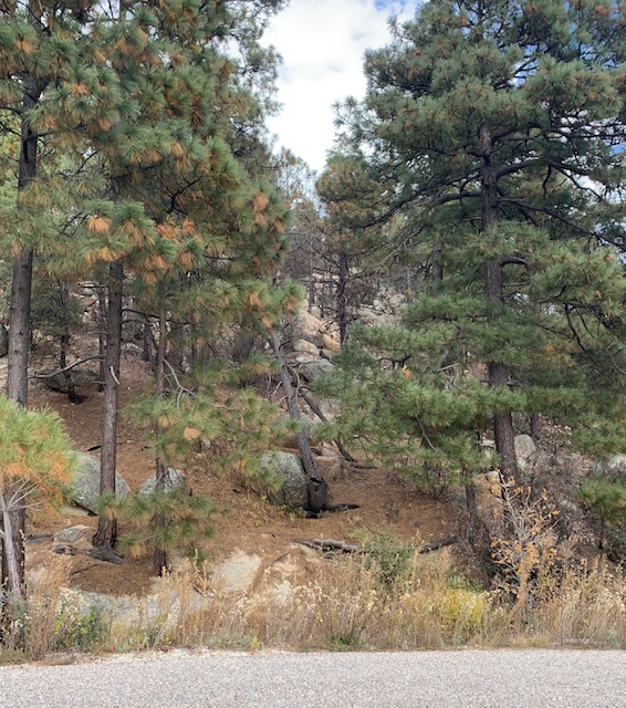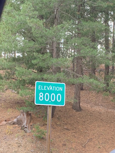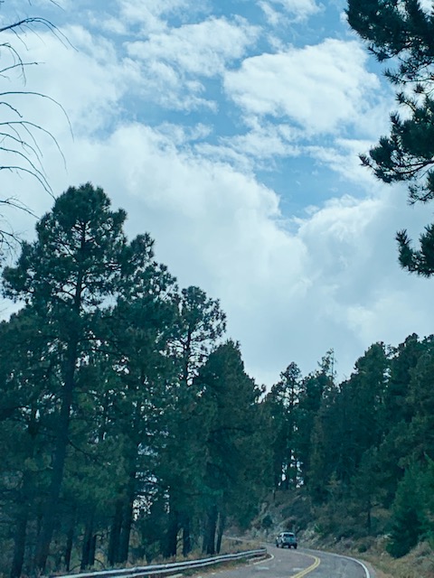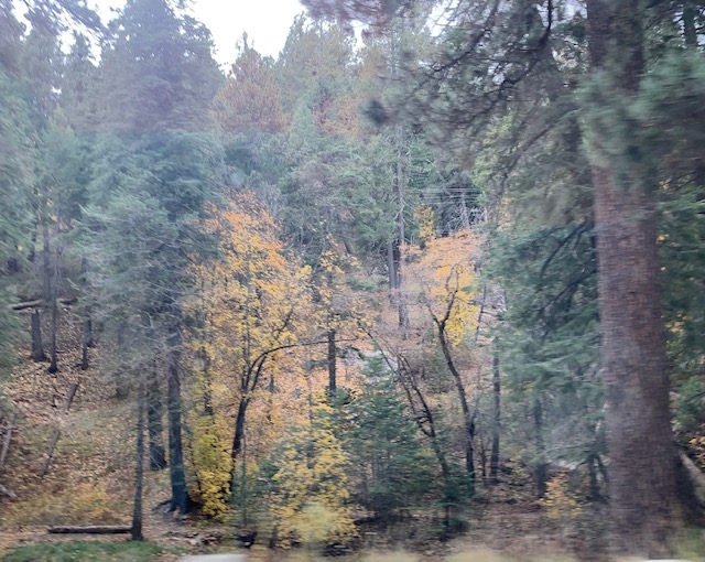 We kept driving higher and rolled up our windows because now we were 8000 ft. elevation, and it was about 45 degrees. All we were seeing is some leaves that changed color and pine trees.