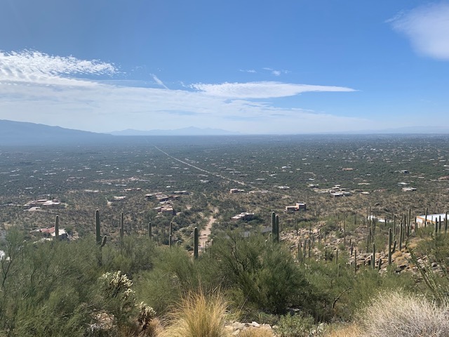 This part of the drive you get to see saguaro cacti, the nearby Rincón Mountains and the city of Tucson.
