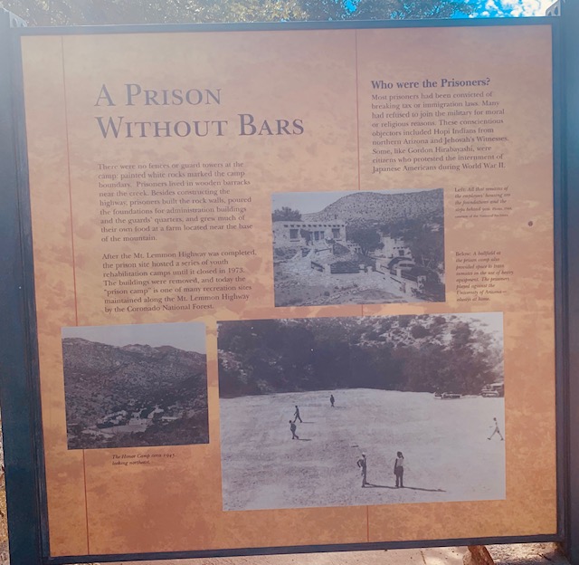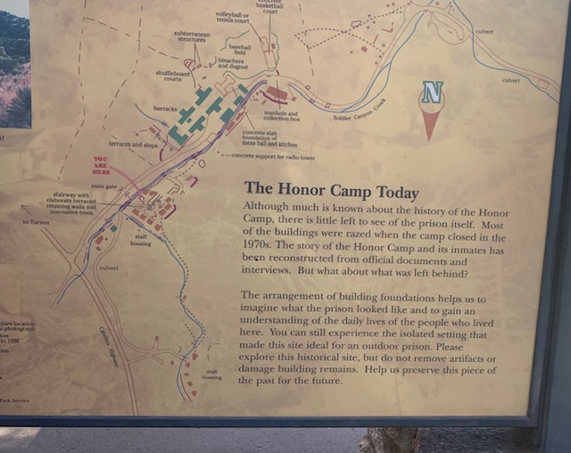 This site is also known as Prison Camp. The site was a Federal Honor Camp beginning in 1937 to house federal prisoners who worked to build a road for access into the Santa Catalina Mountains. The Prisoners had been convicted of federal crimes ranging from immigration law violations to tax evasion to bank robbery.