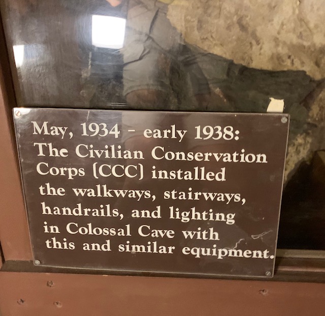 Between 1934 and 1937, two different CCC corps built the first roads, picnic areas, and buildings in Colossal Cave Mountain Park. The cave received stairs, paths, handrails, ladders, and a lighting system, as well. Frank Schmidt was hired by the State of Arizona as a director and held this job until 1956. I wonder long he got to live in the cave?
