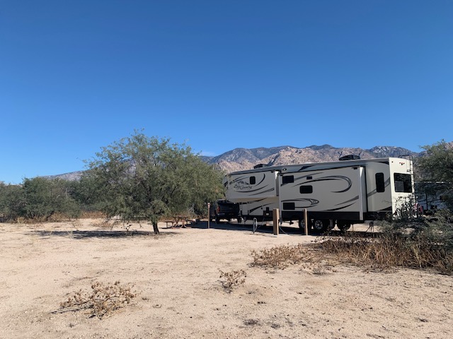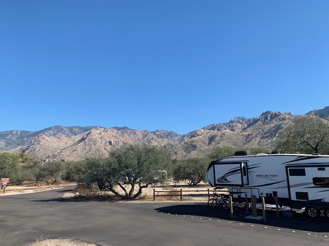 We are now on the western slope of the Santa Catalina mountain range, just north of Tucson. We will be here two weeks. Have a nice long pull thru and views of the mountain range. Drove 71 miles today from Kartchner Caverns State park. It should be pleasant here, unlike what it was like at Karthcner. We did not have a good time there, which I will talk about in my next post. Our spot below.
