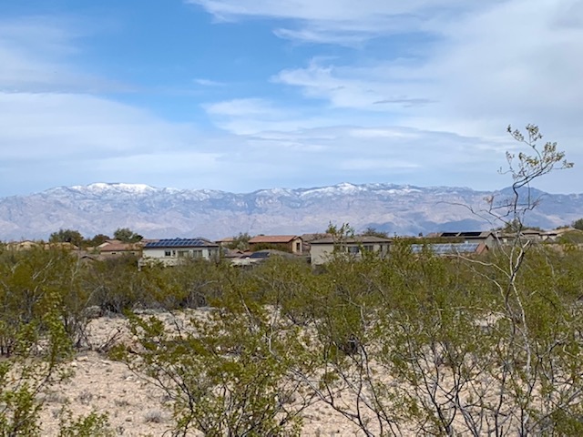 Snow on the top of the mountains, 9,000 ft. above sea level