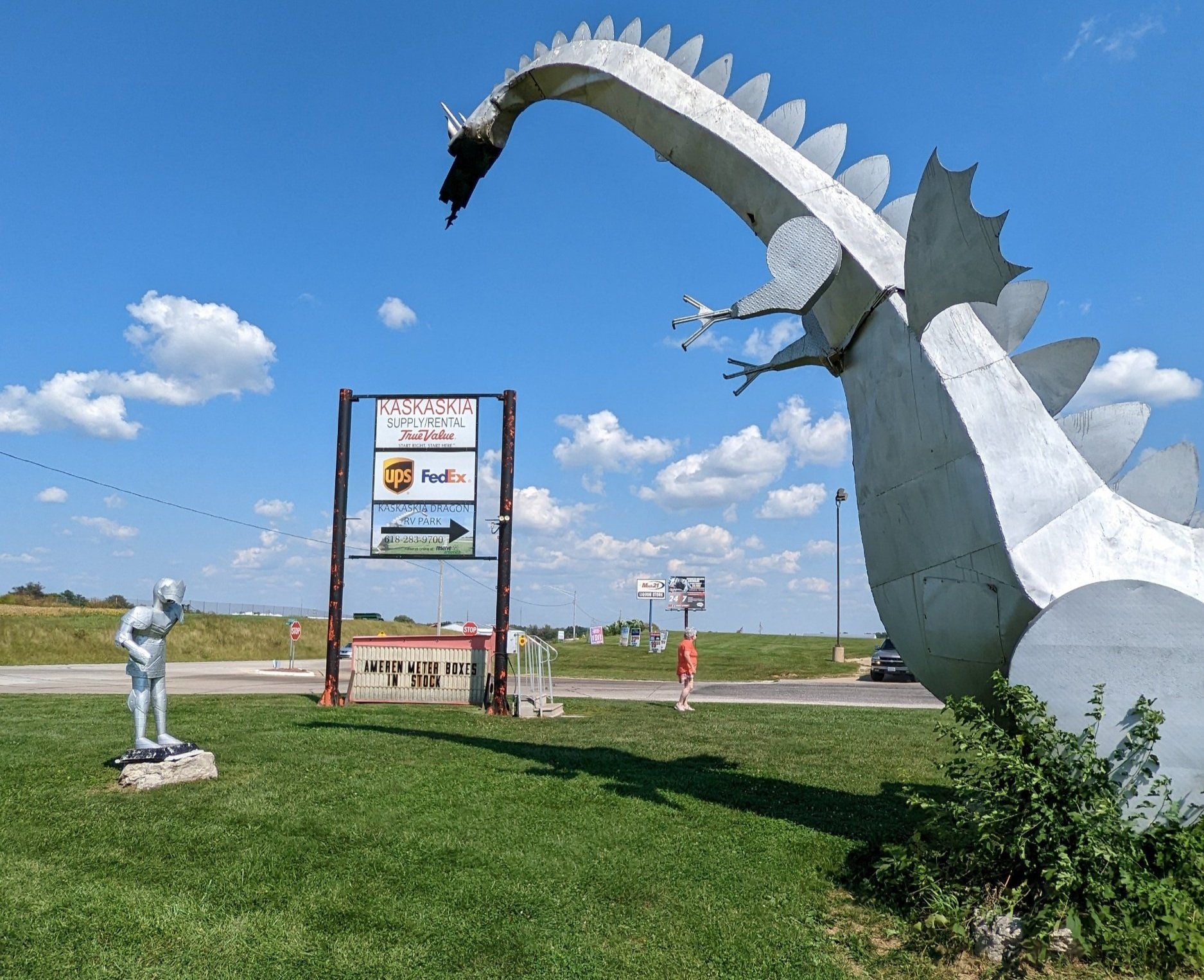 This roadside attraction was built in 1995 by the nearby Kaskaskia Supply and its owner, Walt Barenfanger. In 2001, the dragon moved near the highway in Vandalia, Illinois, to its current resting place, where hundreds of visitors have paid to make the beast breathe fire.