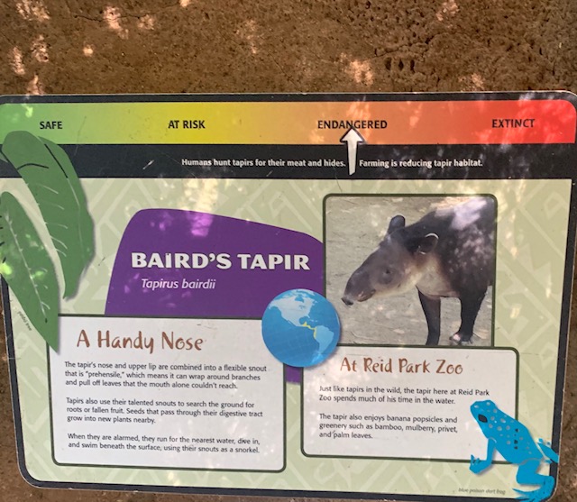 What is neat about the tapir is that it’s nose and upper lip combine into a flexible snout like an elephant’s trunk. They use it like a snorkel when they hear or see a prediture they go underwater and can’t be seen.
