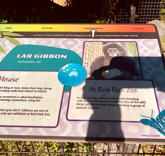 Above it’s Billy a Lar Gibbon Monkey. It isn’t really a monkey because it doesn’t have a tail like a monkey, but why it’s called one who knows? It is under a class called “Lesser apes.” They are found in tropical rainforests of southern and Southeast Asia. What makes him so special in the zoo is because he’s 51 years old, very rare for the species, he outlived both his wife and daughter who were here at the zoo with him. When your walking anywhere in the area of the zoo, if Billy feels like making sounds you’ll definitely hear him. First soft, repetitive one-note sounds, whoop, whoop, whoop, that build to a buildup of long, sustained trills, whooOOoo, whooOOoo. They can produce sounds much louder than any human being can make. What is really sad is that the gibbon species include the most endangered ape species, they also include the most endangered species of primates in the world.
