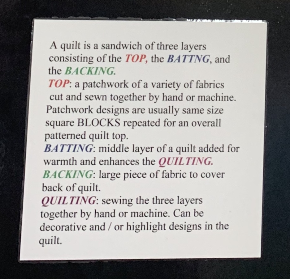 Characteristics of Quilting: Quilting is a method of stitching of layers of material together. The use of bold colors and prints, high contrast and graphic areas of solid color, improvistional pieceing, minimalism, expansive negative space, and alternate grid work.