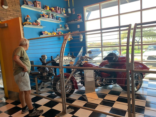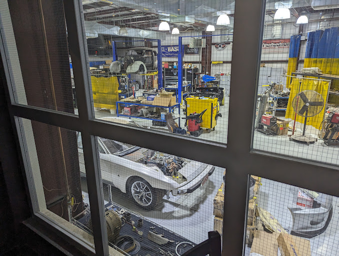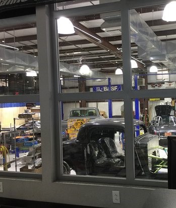 Dave is looking at the menu and to his left you can see the classic cars that are being worked on thru the glass windows.