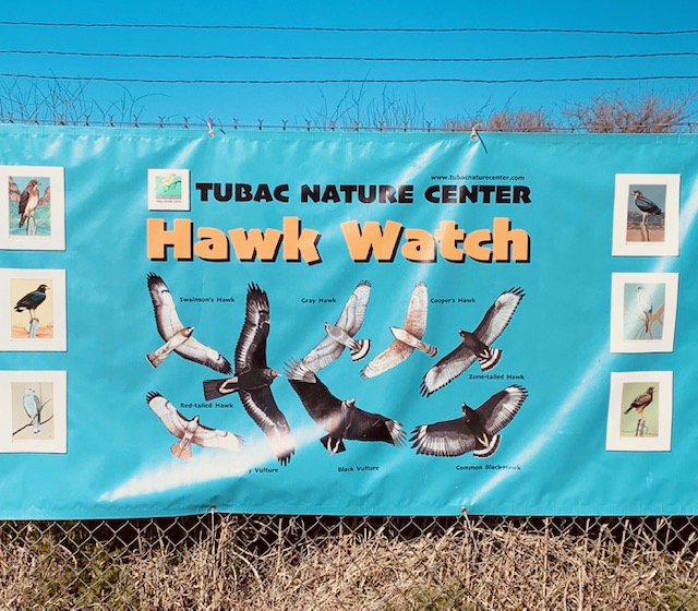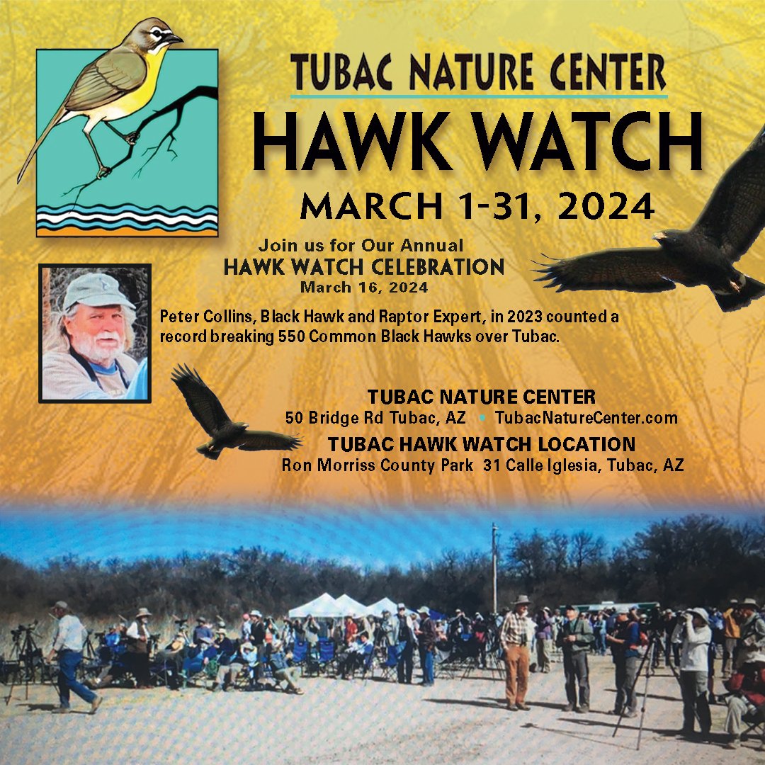 Several thousand raptors (bird of prey) migrate north above the Santa Cruz River to the delight of birders from near and far.  Among the hawks that migrate through is the Common Black Hawk.  Over half of these southern hawks enter the United States through our valley, many roosting in our cottonwoods overnight before continuing their journey.  March 2024 will be the 12th year that Peter Collins will count the hawks over Ron Morriss County Park.”