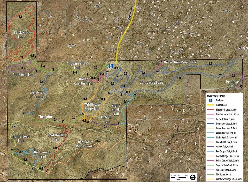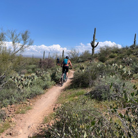 Sweetwater has 15 trails so we headed to the Desperado Loop to NightHawk then Oxbow to Red Tail, Red Canyon, Ocotilla Hill up to Wildflower then Roller Coaster and we were done.