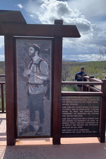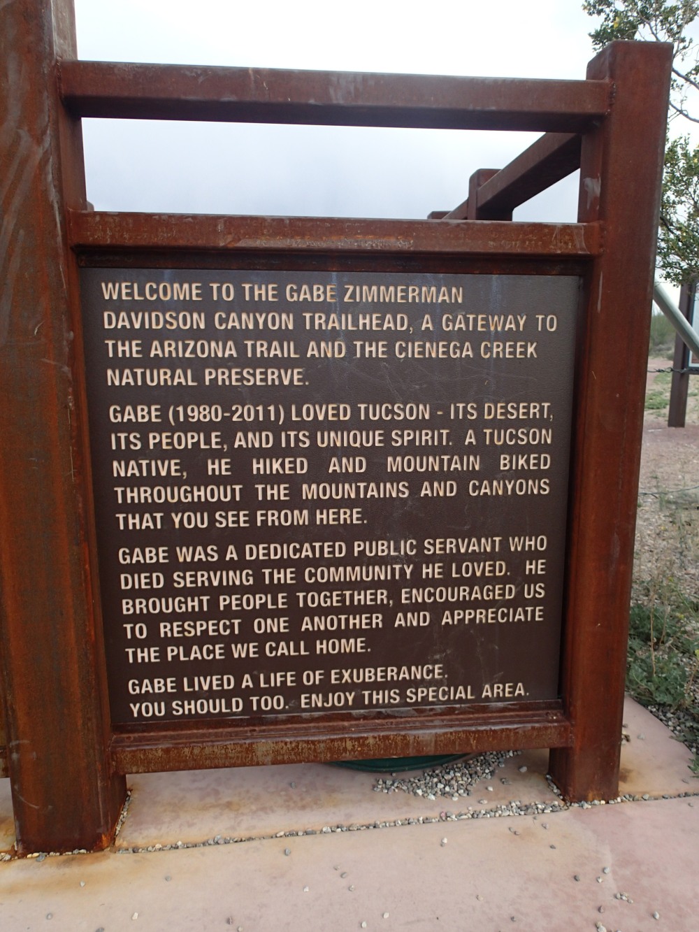 The trailhead ” Gabe Zimmerman Davidson Canyon,” is a memorial for him. On January 8, 2011, at a Safeway in Tucson a gunman killed six and wounded 13, Gabe Zimmerman was one of the six who died. He was 30 years old and was a well known congressional aide and social worker. He hiked all around this area.