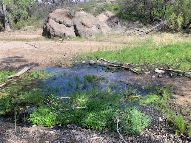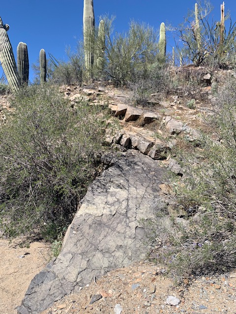 About a mile up the trail on both sides of the wash by a small damn, there were petroglyphs. Created by the local Hohokam people, who called southern and central Arizona home from approximately 450 to 1450 AD. The petroglyphs are believed to have been created during that time.