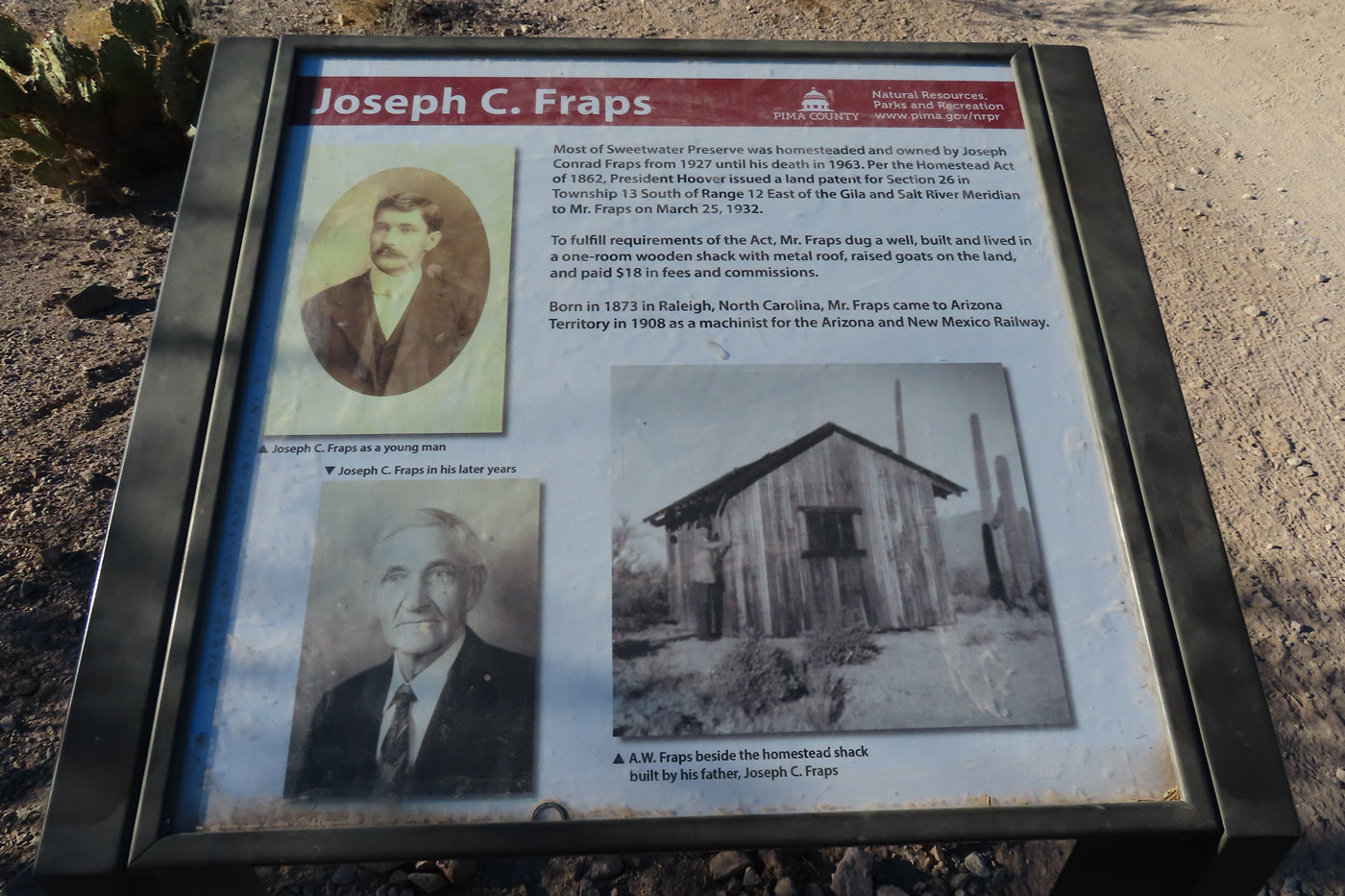 This sign is at the enterance tells about Joseph Conrad Fraps. He came to Arizona from North Carolina in 1908 and was a railway machinist. To fulfill the requirements of the 1862 Homestead Act, Mr. Fraps built his house right in Sweetwater Preserve. He dug a well, built and lived in a one-room wooden shack with a metal roof and raised goats on the land, and paid $18 in fees and commissions. He was there from 1927 until he died in 1963. He was 90 years of age.