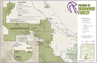 Ironwood Forest National Monument is located in Marana in the Sonoran Desert. The monument covers 129,055 acres and contains a significant system of cultural and historical sites covering a 5,000-year period. This also includes several desert mountain ranges including the Silver Bell, Waterman, and Sawtooth, with desert valleys in between.