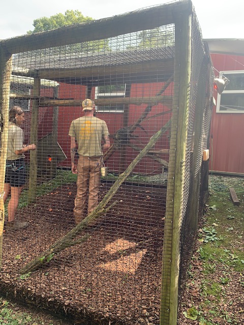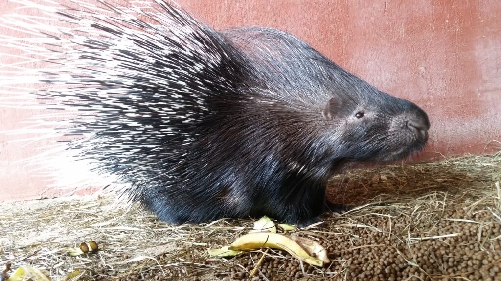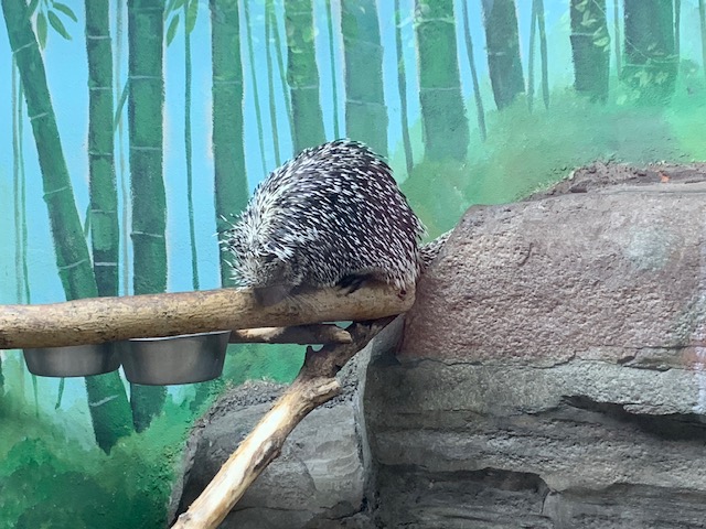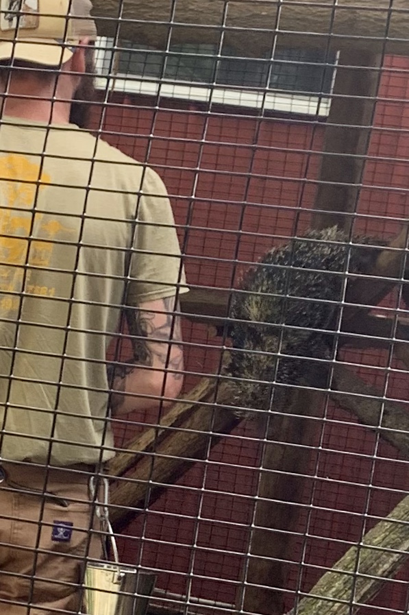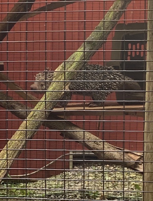This cute but prickly animal is an African Crested Porcupine. Beth and I watched as they were teaching it to go into his inside cage and come out in the winter to be fed.
