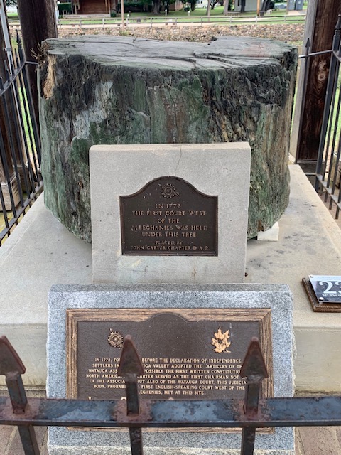 The first court meeting was held under a sycamore tree in May 1772 in Tennessee. The court was called The Watauga Court Association. The Watauga Association was the first free government in North America, established by settlers in the Watauga Valley. The court was likely the first English-speaking court west of the Alleghenies. The dedication plaque from July 4, 1991, reads: “In 1772, four years before the Declaration of Independence, settlers in the Watauga Valley adopted the Articles of the Watauga Association, the first written constitution in North America.