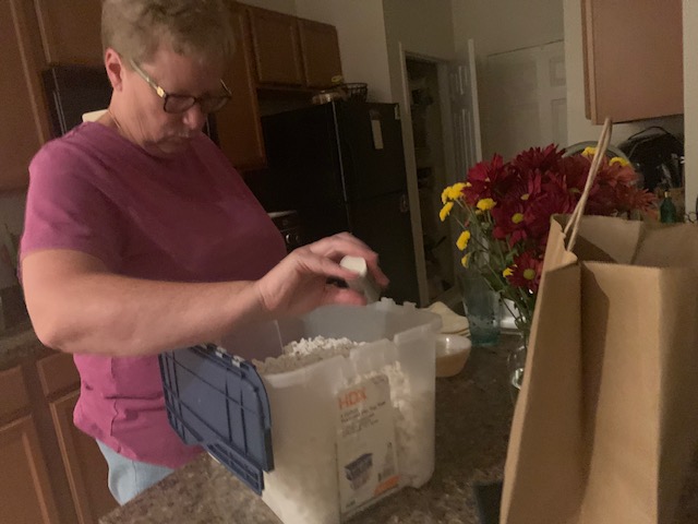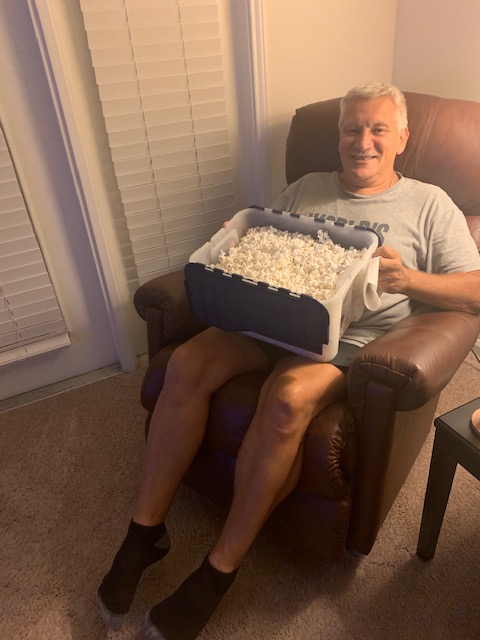 Beth made popcorn for Dave. He loves her popcorn as you can see, she made a tub for him for the Bills game and for our trip back to Tucson. Unfortunately the Buffalo Bills lost that night. 😒