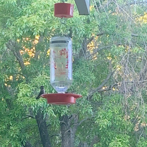 1 Berylline Hummingbird — Visiting feeders infrequently. Slightly decurved dark bill. Rufous wings and with a green dark head and throat. Buzzy rattle noted prior to feeder visits
