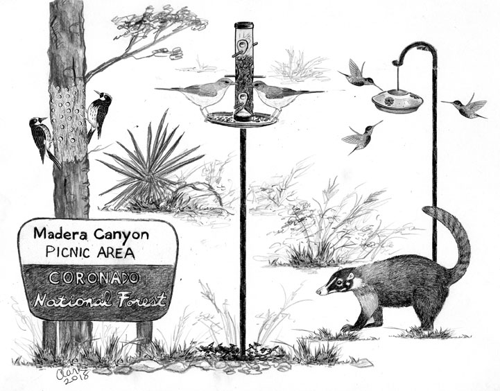 Once again, I went with my friend Marcia and some of her fans to Madera Canyon to bird watch. It’s located on the northwest face of the Santa Rita Mountains in the Coronado National Forest. It’s known for it’s mesquite, juper-oak and pine tree woodlands that offer some of the world’s best bird watching and hiking areas.