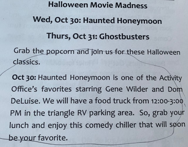 It’s Halloween Eve, it used to be called it Begger’s Night. Dave, me and Sharon went to see Haunted Honeymoon at the movie room in Voyager. Sharon made great popcorn for the show.
