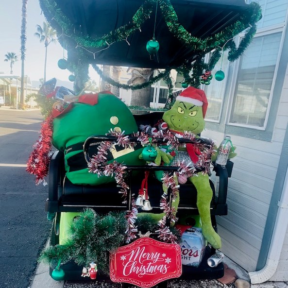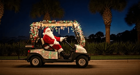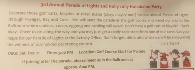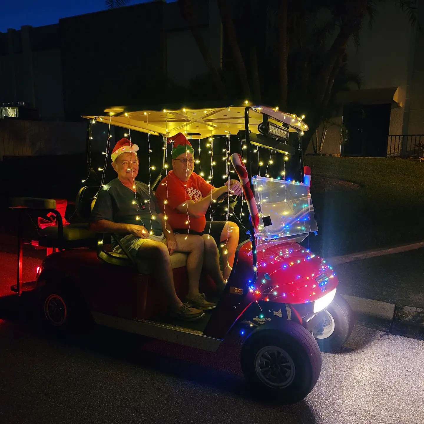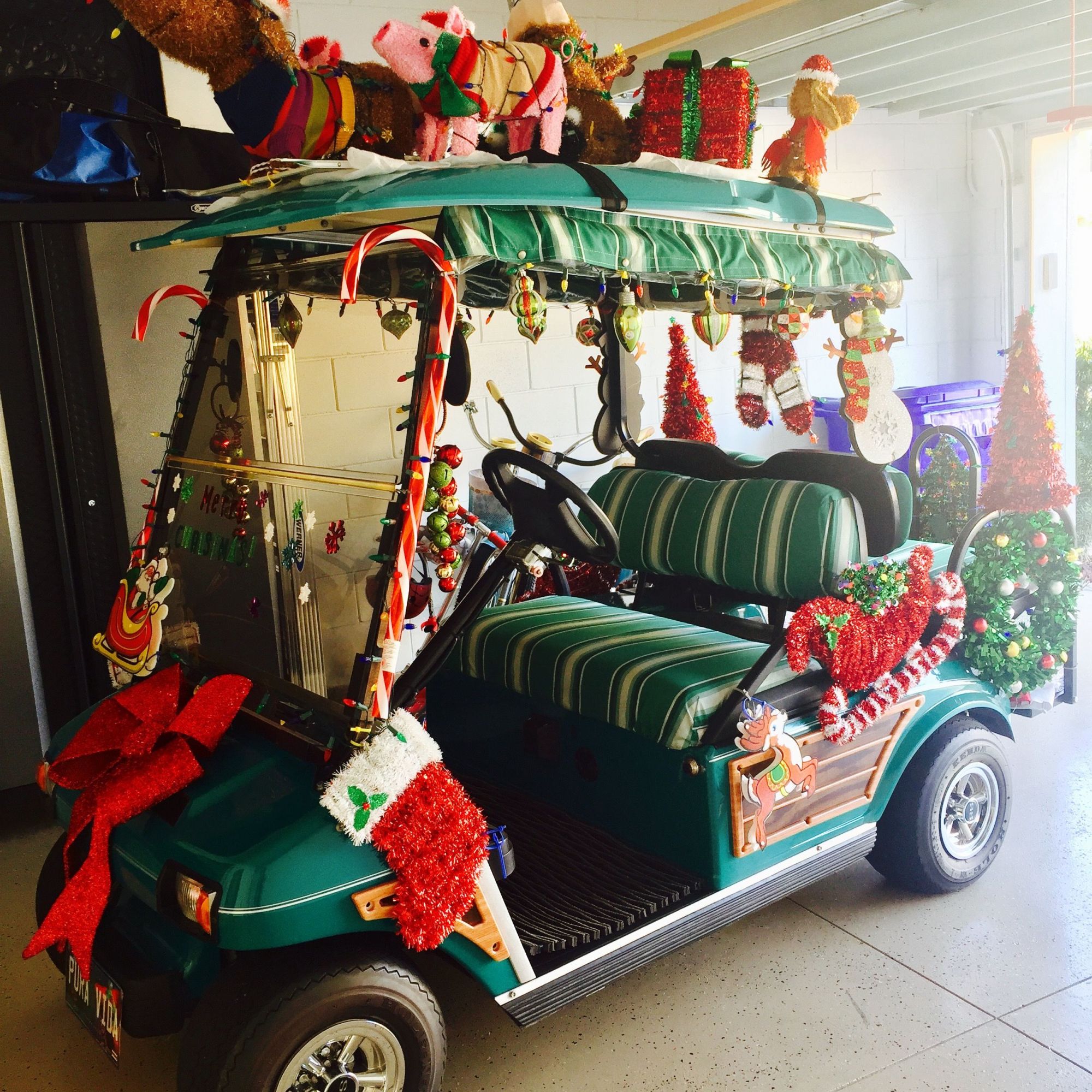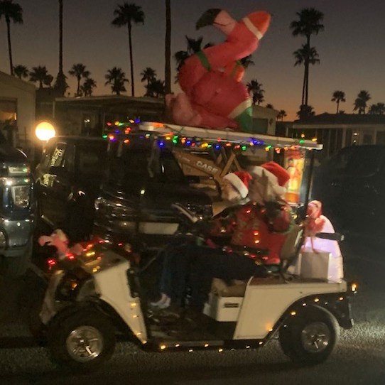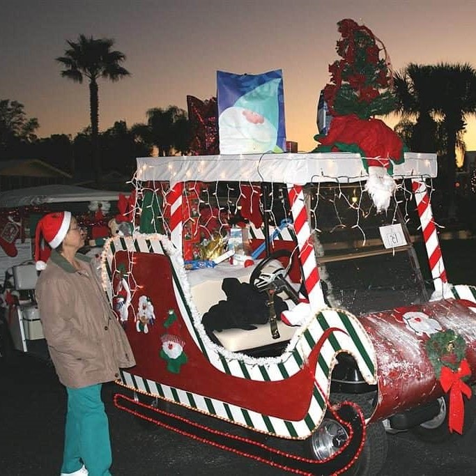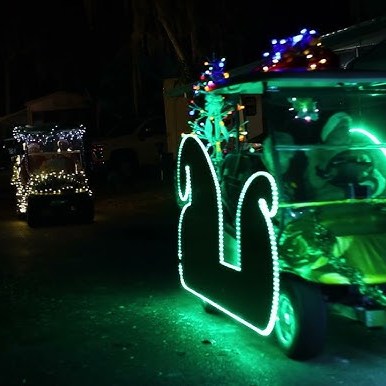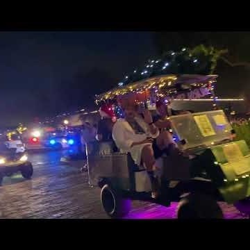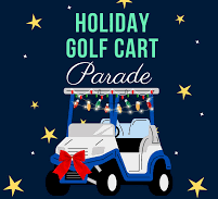 Golf carts in the parade. ❄️ 🎵Oh what fun it is to ride in a golf cart or ride a bike 🎶🎄Or just watch like we did.