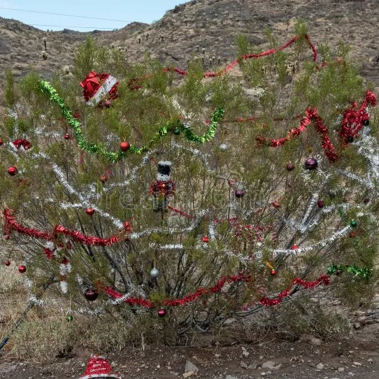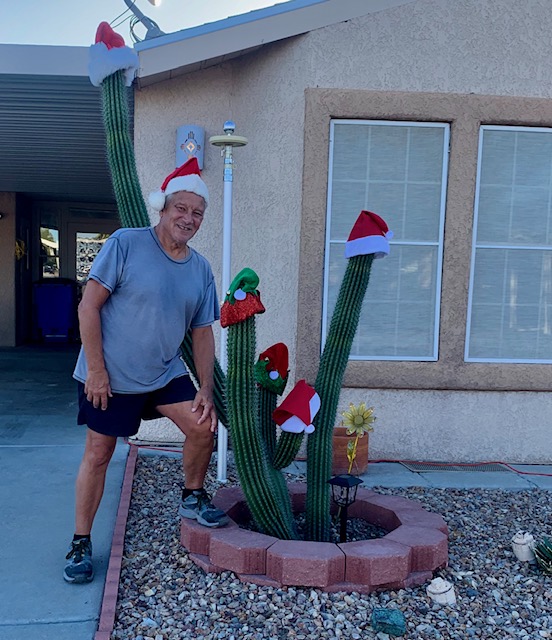 It’s that time of year when the saguaro, ocotillo, agave, prickly pear, etc. cacti and tree trunks of the Palo Verde and Mesquite trees are decorated with Christmas ornametns of all kinds just like a Christmas trees. The folks at Voyager love to decorate as you can see.