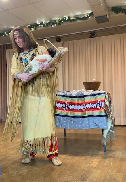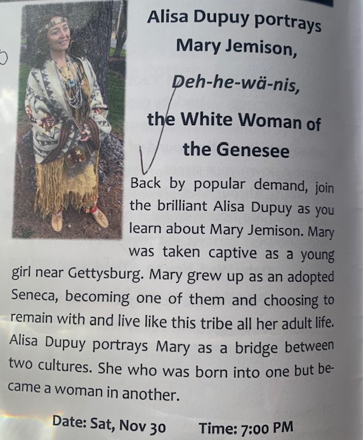 We went to see Alisa Dupuy as Mary Jemison “The White Woman of the Genesee.” Also known as: Deh-he-wä-mis. We saw her twice before when she was at Voyager. Once she portrayed “Mathra Washington” and last Christmas she did the “Christmas Carole” she acted out all the roles of the different characters in the movie. She did a great job doing those so we went to see her again as Mary Jemison.