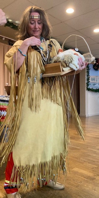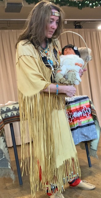 She talked about the life of Mary Jemison who when she was 15 was taken from her western Pennsylvania home by a Shawnee and French raiding party. Her family was killed, but Mary was traded to two Seneca sisters who adopted her. She lived to survive two Indian husbands, the births of eight children, the American Revolution, the War of 1812. In 1833 she died at about age ninety. She talked about the Indian ways and what she had learned. Her mother told her never forget how to talk english and always remember her families names, which she did.