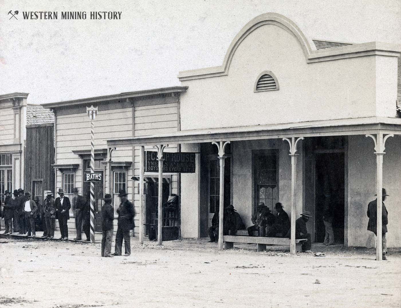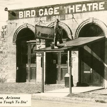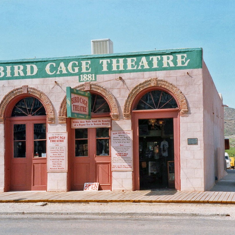 “The town was established on Goose Flats, a mesa above the Goodenough Mine. Within two years of its founding, although far distant from any other metropolitian area. Tombstone had a bowling alley, four churches, an ice house, a school, two banks, three newspapers, and an ice cream parlor, alongside 110 saloons, 14 gambling halls, and numerous dance halls and brothels. All of these businesses were situated among and atop many silver mines. The gentlemen and ladies of Tombstone attended operas presented by visiting acting troupes at the Schieffelin Hall opera house, while the miners and cowboys saw shows at the Bird Cage Theatre and brothel.”