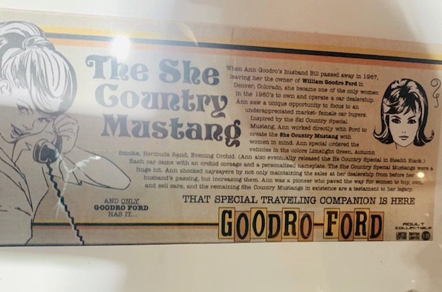 Bill Goodro Ford in Denver, Colorado was a well-known Denver dealership. After Bill Goodro passed away on May 5, 1965, his wife, Ann, took over the business. Ann Goodro marketed a She Country Mustang starting in April 1967.
