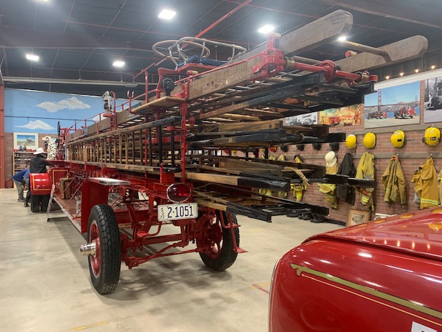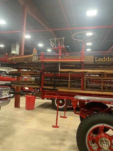 This is a long 1923 ALF tiller straight frame fire truck. It had a service ladder that was unique because its rear drive wheels could be steered by a tillerman sitting on the seat in the back. This allowed for enhanced maneuverability in tight spaces. The truck is about 40 ft. long and it took 4 or 5 firemen to work this truck. They just had this fire truck out and about, it would have been neat to see how the operate it.
