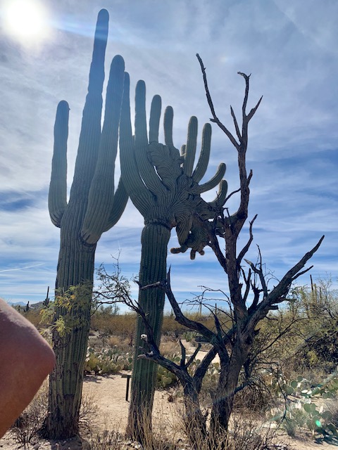 We took a trail and saw a rare Broccoli saguaro, also known as crested saguaros. They have a fan-shaped crest at the top of their main stem or arms that look like broccoli. Scientists estimated that for every 200,000 normal cacti, there is only one Broccoli Saguaro.