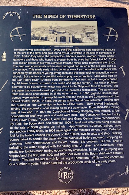 We all enjoyed the tour, it was definitely a unique and authentic adventure. I never realized and was amazed at how hard a job it was, especially working 10 hour days. As you can tell the life of a silver miner blew me away, I hope I didn’t bore you. Mining continued all over Tombstone for a couple of decades until the mid-1920s when most of the ore had been mined out. By 1930 most of the mines in the district had closed down and most of the miners left town. Mining however continued on small scale for more years. Today the town of is a small town of just about 1000 people. People still venture out into the desert in search of gold and silver using metal detectors and other simple tools.