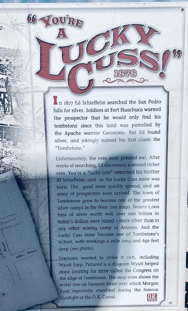 He named the mine the Lucky Cuss and it went on to become one of Arizona’s richest silver mines yielding 1,500 dollars silver to the ton in silver and 1,500 in gold. Tombstone’s total yield in gold and silver in today’s dollars amounted to some $1.7 billion