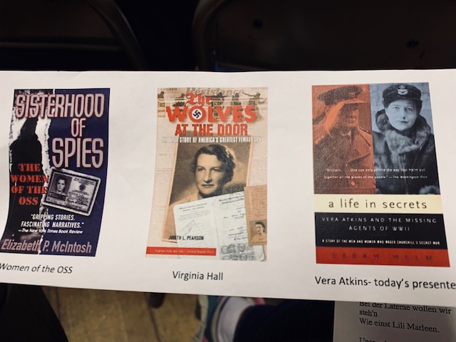 Then Vera Atkins talked about an amazing spy Virginia Hall. Vrginia was an American working for British intelligence during World War II France. She had lost a leg in a hunting accident years before. She named her prosthetic leg Cuthbert, she went by the name of Marie, Brigitte or any of a half dozen other names. Some saw her as a middle-aged newspaper reporter. To others, she was a doddering old woman. To the Nazis, she was an elusive enemy, “The Lady Who Limps.” She was so feared her that Klaus Barbie, among the most savage of Nazi leaders, ordered an urgent search for the woman he called the most dangerous of all Allied spies. She went on to become the first woman field agent sent into France before and during the occupation. She set up spy networks and safe houses, and engineered a prison escape and the explosion of Nazi supply lines. She also organized resistance groups, helped conduct sabotage operations, and reported secret intelligence back to the Allies. She was never caught, and escaped France by trekking 35 miles (56km) across the icy Pyrenees, in constant pain from Cuthbert. She was the first agent to live behind the lines in Vichy. She was one of the first women agents in the CIA and was the only civilian woman of the war to receive the Distinguished Service Cross. Virginia Hall is quite a lady with her immense personal courage and determination, and how she broke through the barriers of physical limitation and gender discrimination to become America’s greatest feared spy of World War II.