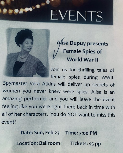 Women spies greatly helped in ending WWII, some say it would have lasted a lot longer or we wouldn’t have won the war. Either way, I never realized there were so many women spies that helped tremendously during the war with different skills and abilities. When Alisa Aupuy studied for this show she didn’t realize how many spies there were, especially American women, so she had to only pick a few to talk about. She also mentioned how these great women who were tremendous spies went back home to presume their roles as housewives, cooking and doing the laundry. Not telling any body of what you went thru during the war. If they did tell I’m thinking they would walk away thinking “what the heck is she on”