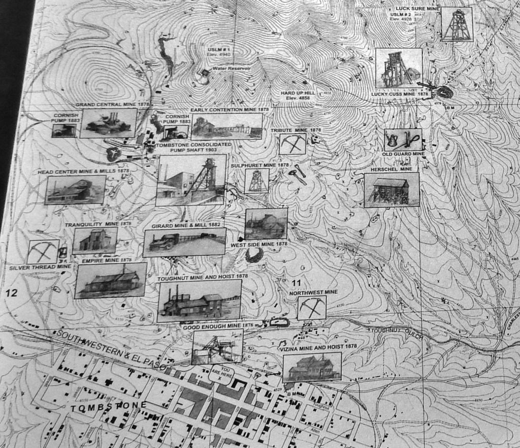By 1880 there were over 3000 mining claims in the Tombstone district. Most of these claims were small operations that did not make a lot of headlines with their productions. However, there were several established operations with machines that produced thousands of tons in ore. Some of the notable mining operations in the district included, The Lucky Cuss Mine, The Tribute Mine, The Tough Nut Mine, The Owl’s Nest Mine and the The East Site Mine.