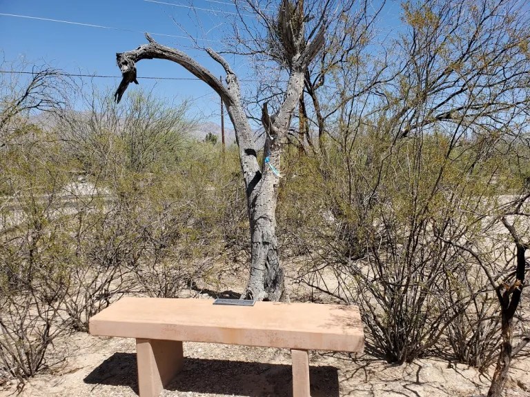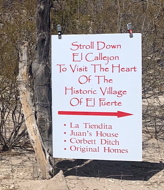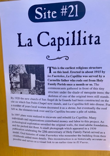 And outside La Chapillita is a bench with a dead mesquite tree trunk behind it. The story is that the mesquite tree was left in place as a reminder of the original El Fuerte families who stood outside the chapel under a mesquite tree for Sunday Mass.