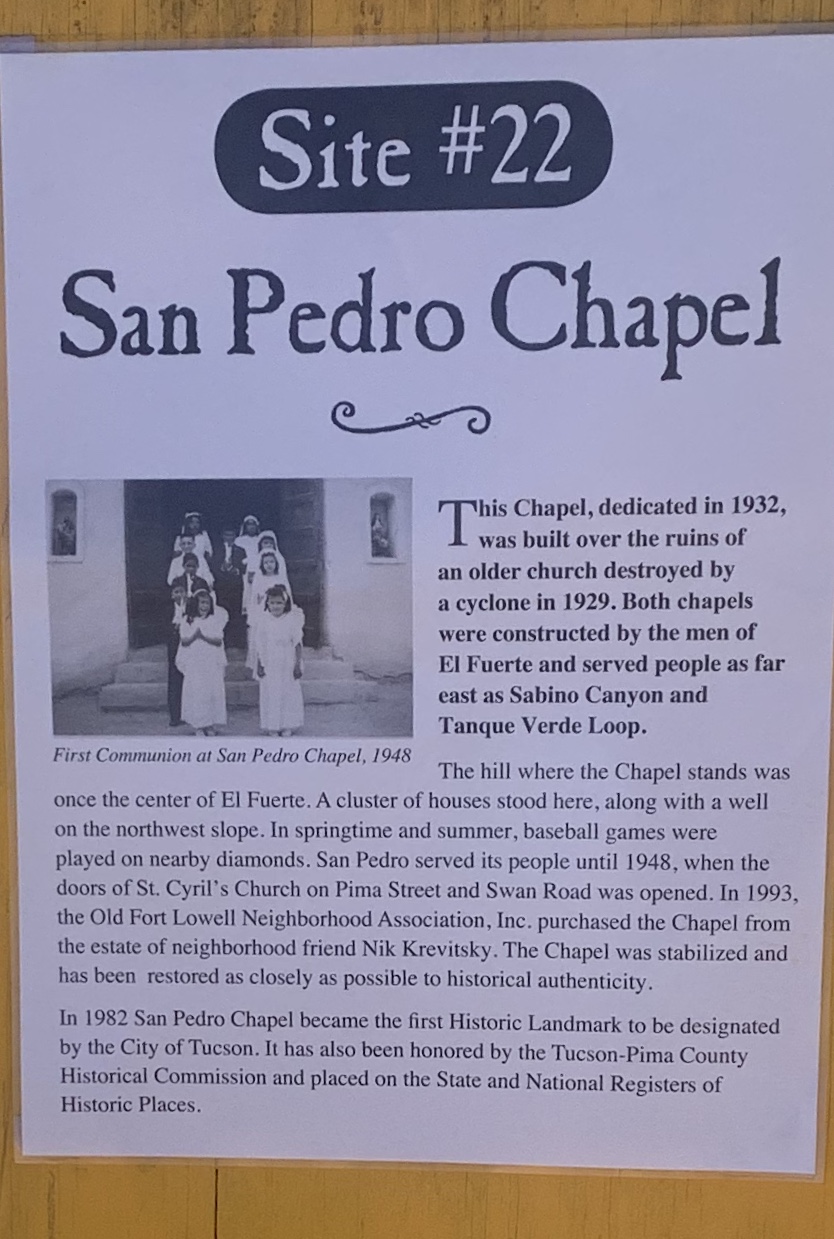 When the Fort was no longer, Mexican families moved into the area. They used materials from the fort’s buildings, they constructed a growing community and built the San Pedro Chapel.  The Chapel sits on a hillside overlooking the Old Fort Lowell Neighborhood with spectacular views of Tucson’s Catalina Mountains. It was such as awe-inspiring surprise to see the San Pedro Chapel and the surrounding neighborhood. It is Tucson’s first designated Historic Landmark, on the National Register of Historic Places. It was built of mud adobe by residents of the neighborhood in 1932 and served as their principal place of worship for decades. Although no longer used for worship services, it is still used for wedding and other events.
