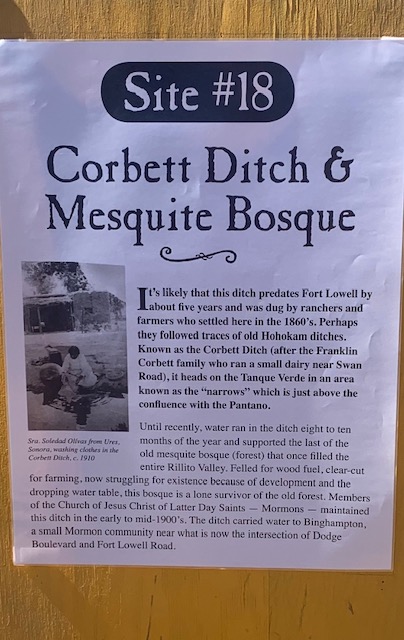 The Corbett Irrigation Ditch, dating back to the 1860s, served as a lifeline for agricultural activities in the area. Fed by gravity from the Tanque Verde area, the ditch supported a thriving mesquite bosque, a remnant of the old Fort Lowell Mesquite Bosque. However, urban development and water scarcity have threatened the existence of both the ditch and the bosque, highlighting the challenges of preserving historical landscapes in a rapidly changing environment. The community is helping to save the ditch, one of the things they are doing is removing an invasive plant that is taking over the area.