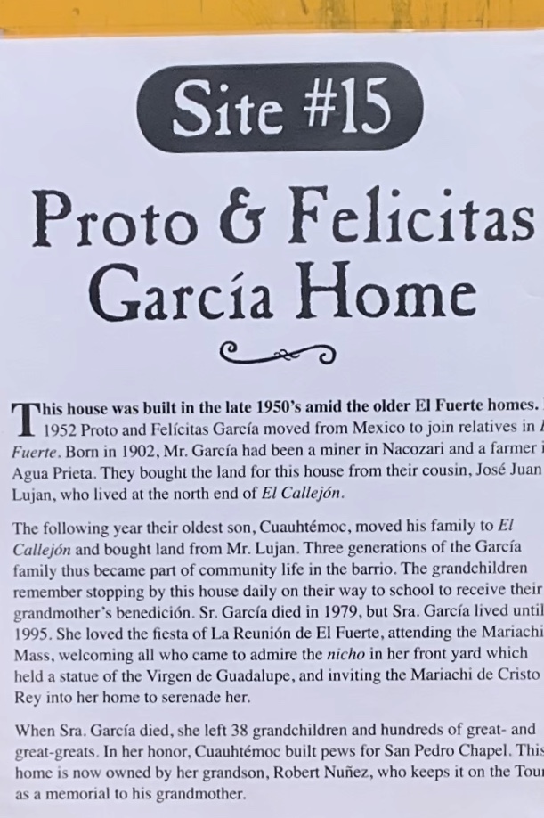 Another Mansion, Built in1952 the house was owned by Proto and Felicitas García and later their son Cuauhtémoc, a skilled carpenter and miner, contributed to the restoration in the neighborhood. His craftsmanship and dedication to preserving heritage were evident in the construction of a beautiful capillain in front of his house, honoring his wife and mother.