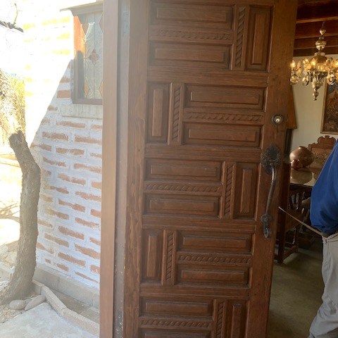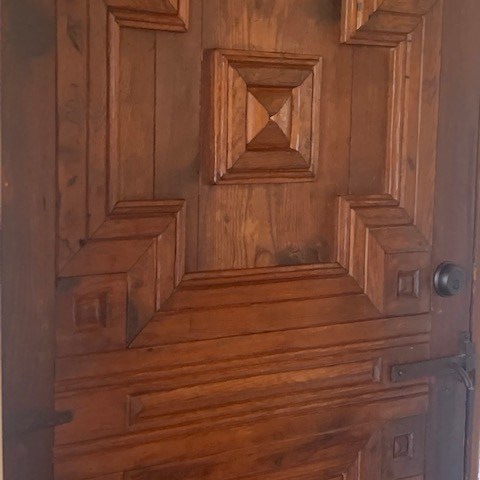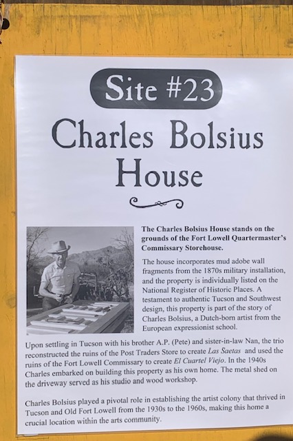 1934 – 1960s:  Dutch brothers Charles & Pete Bolsius, and Pete’s wife Nan Bolsius, spotted the ruins of the Post Trader’s Store at 5325 East Fort Lowell on a trip to Tucson from Santa Fe. They bought and restored it, with Nan & Charles hand carving doors and beams and sculpting . Later they bought the adjacent Quartermaster’s Commissary, restoring it in the same way. Charles was a painter, having studied at the Hague; Pete’s primary role was to earn the money which supported all three during the restorations, but he also worked with tin, making candelabras, frames and lamps.
