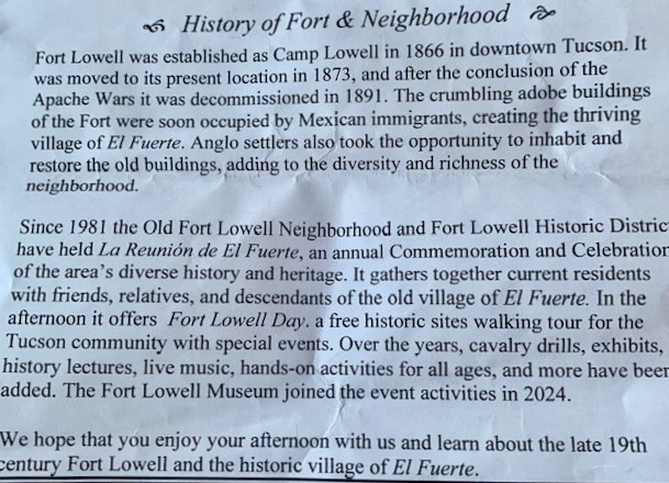On Saturday March 8th we went to the Fort Lowell Museum located in the park to the “Fort Lowell Day Celebration of History of the Fort and neighborhood.” It included a self-guided walking tour along Fort Lowell Road, and at the historic San Pedro Chapel, 5230 E. Fort Lowell Rd. Tucson.