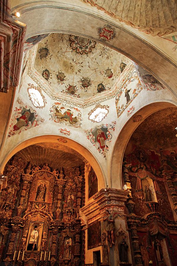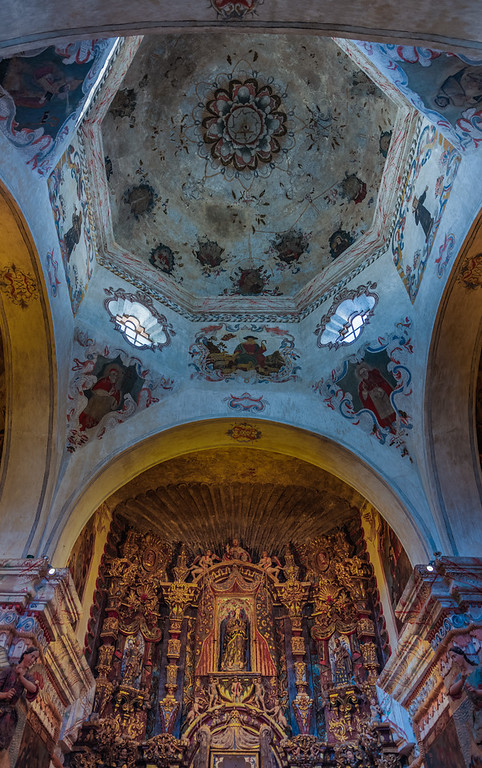 The alter was once again has been painstakingly restored using only original materials found in the desert, basically they hand painted bricks on the wall using plant dies, not an easy job. The amount of artwork on the walls and ceiling is completely overwhelming considering it was done over 220 years ago by Indians climbing up over 50 feet to the ceilings on log ladders that were tied together with leather straps.
