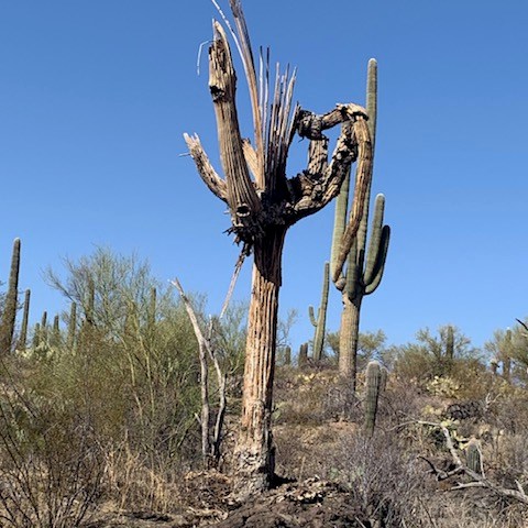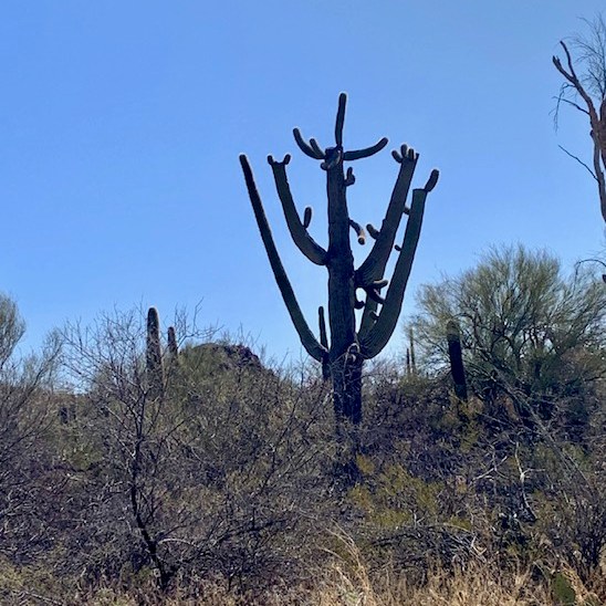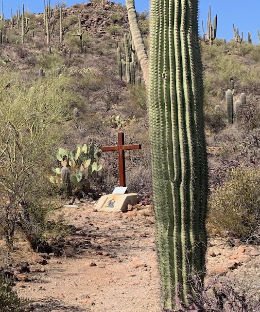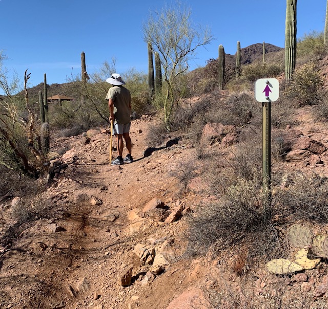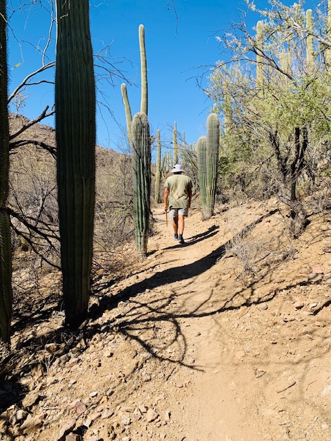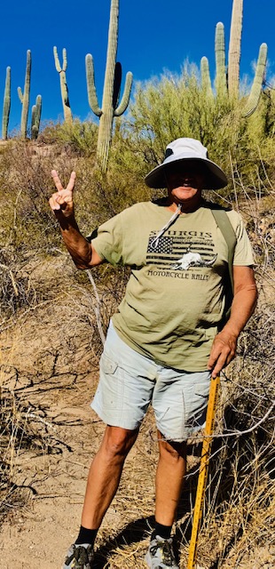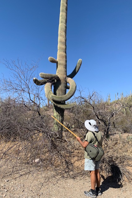 There is a peace sign saguaro behind Dave, who is giving us a peace sign.