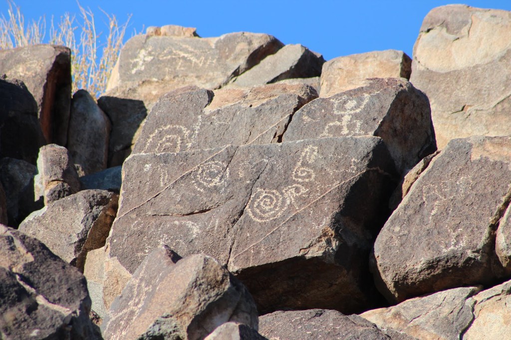 The site’s glyphs are of a variety of designs, depicting anthropomorphs (human-like figures, but archaeologists are unsure if they depict humans, deities, or something else), animals, and designs such as spirals. Archaeologists are unsure of the meanings of most of the petroglyphs, however, one of the spiral glyphs on the west face of the rock formation interacts with the sunlight in a way that indicates its use as a calendar. During each fall equinox and summer solstice, the light interacts with the glyph to form a “light dagger” through the center of the spiral.