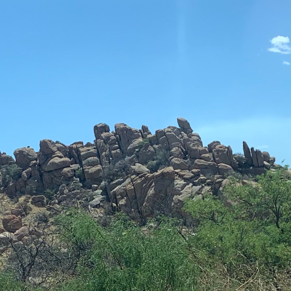 One of the most striking features of Texas Canyon is the dramatic cliffs and towering spires that rise up from the desert floor and boulders that balance on top of each other.